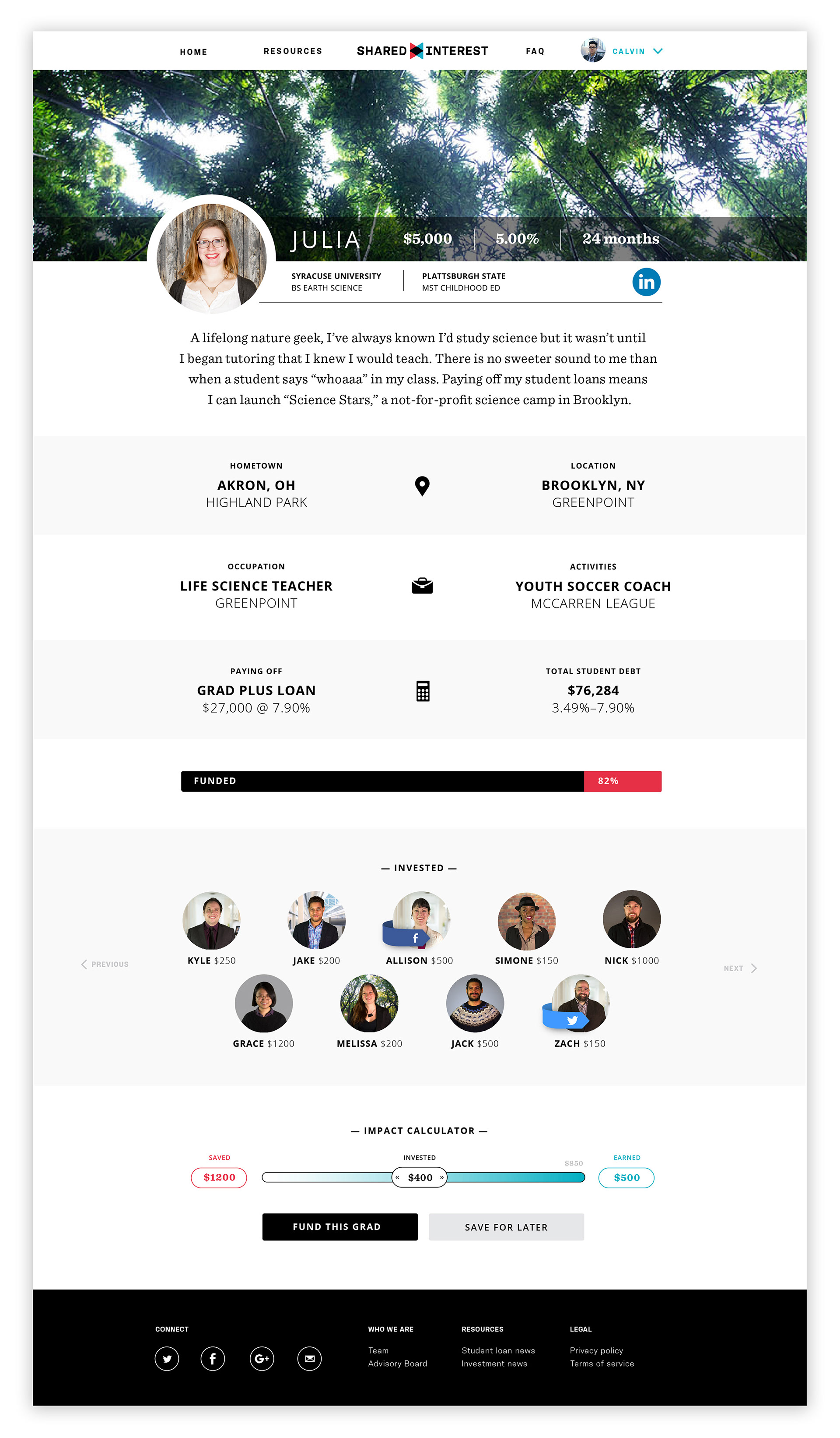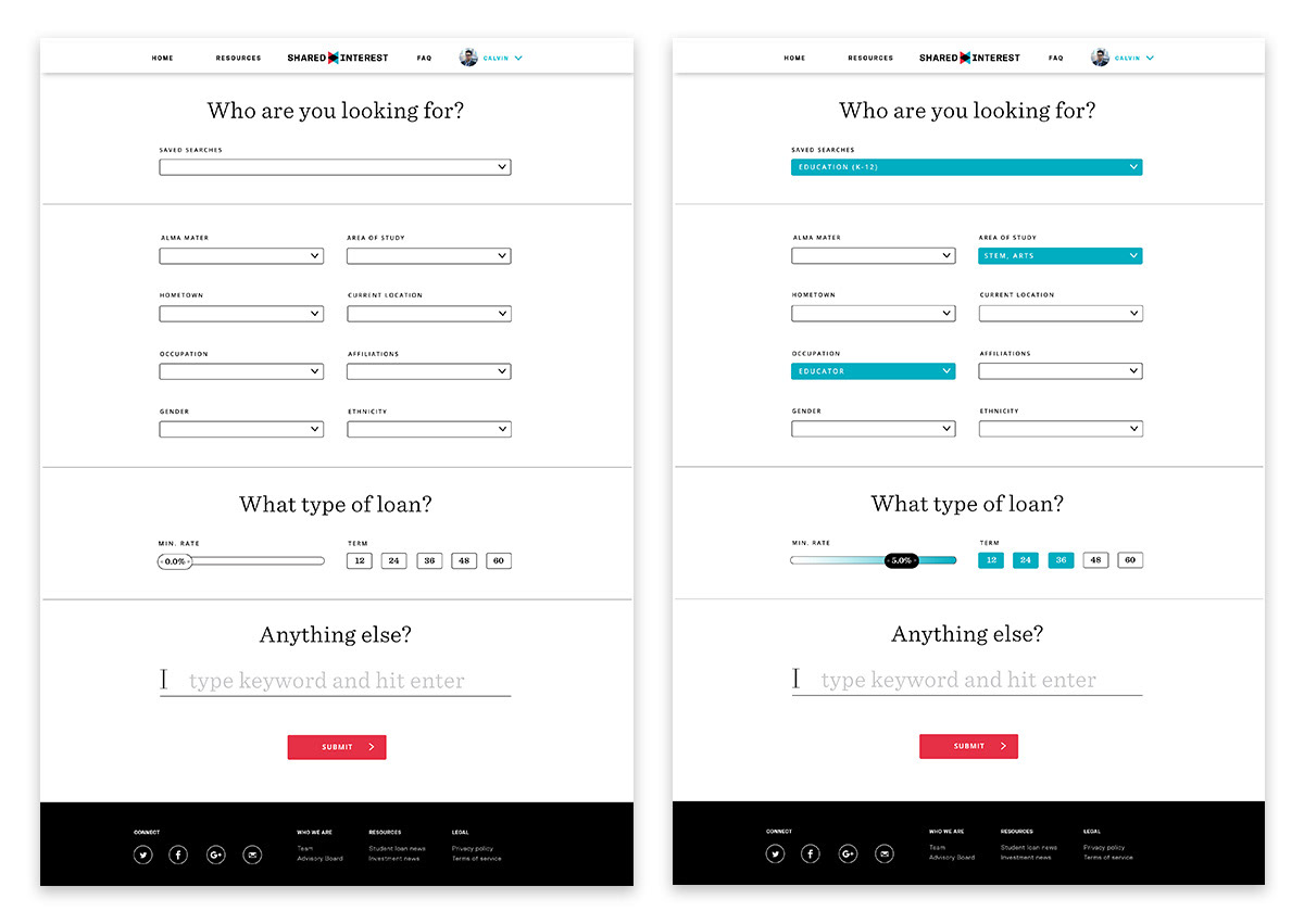 Some elements from my thesis, Shared Interest, a peer-to-peer lending platform for refinancing student loan debt. The result of a year and a half of research, design, iteration, and testing. More info at sharedinterest.com.